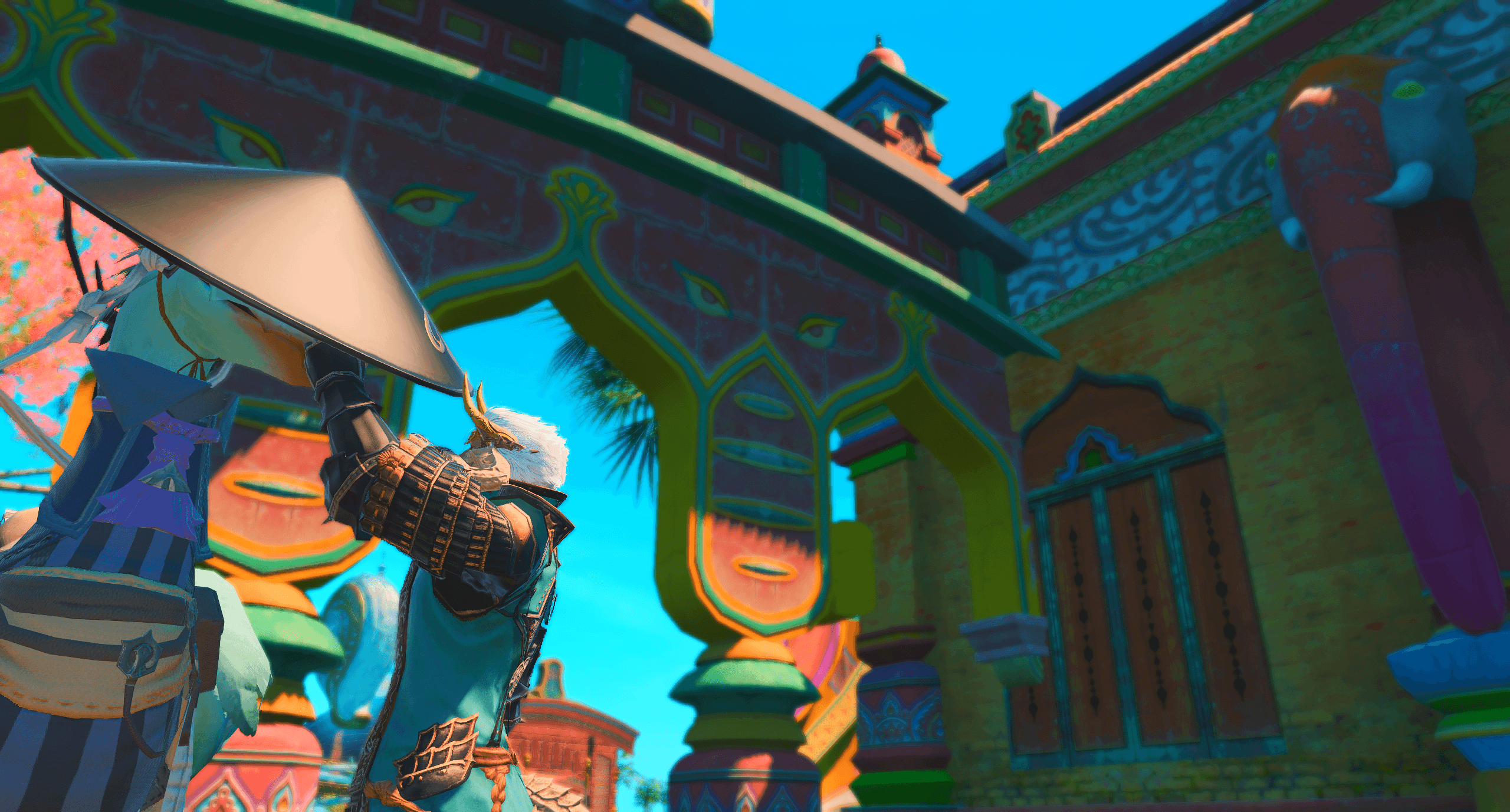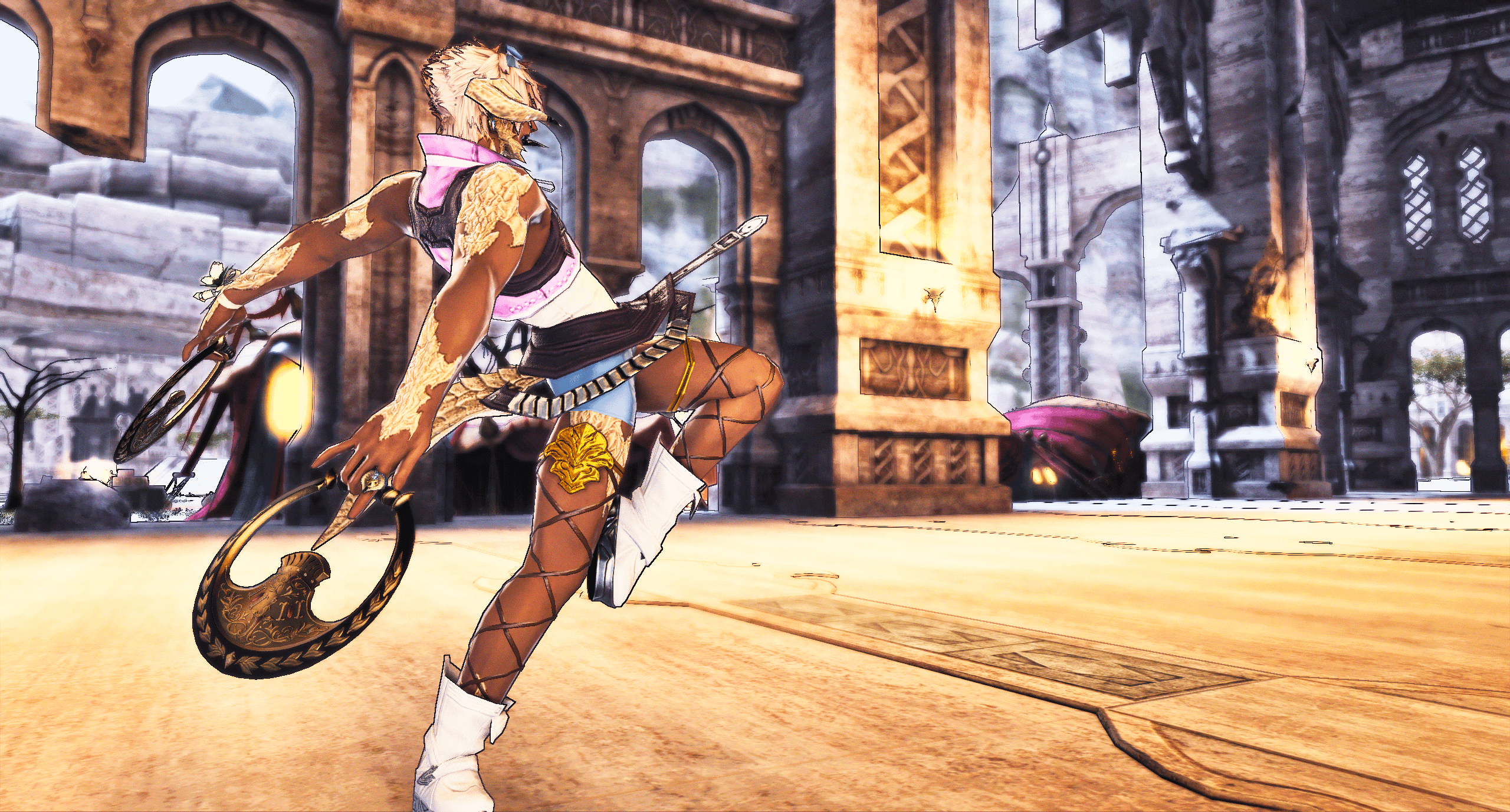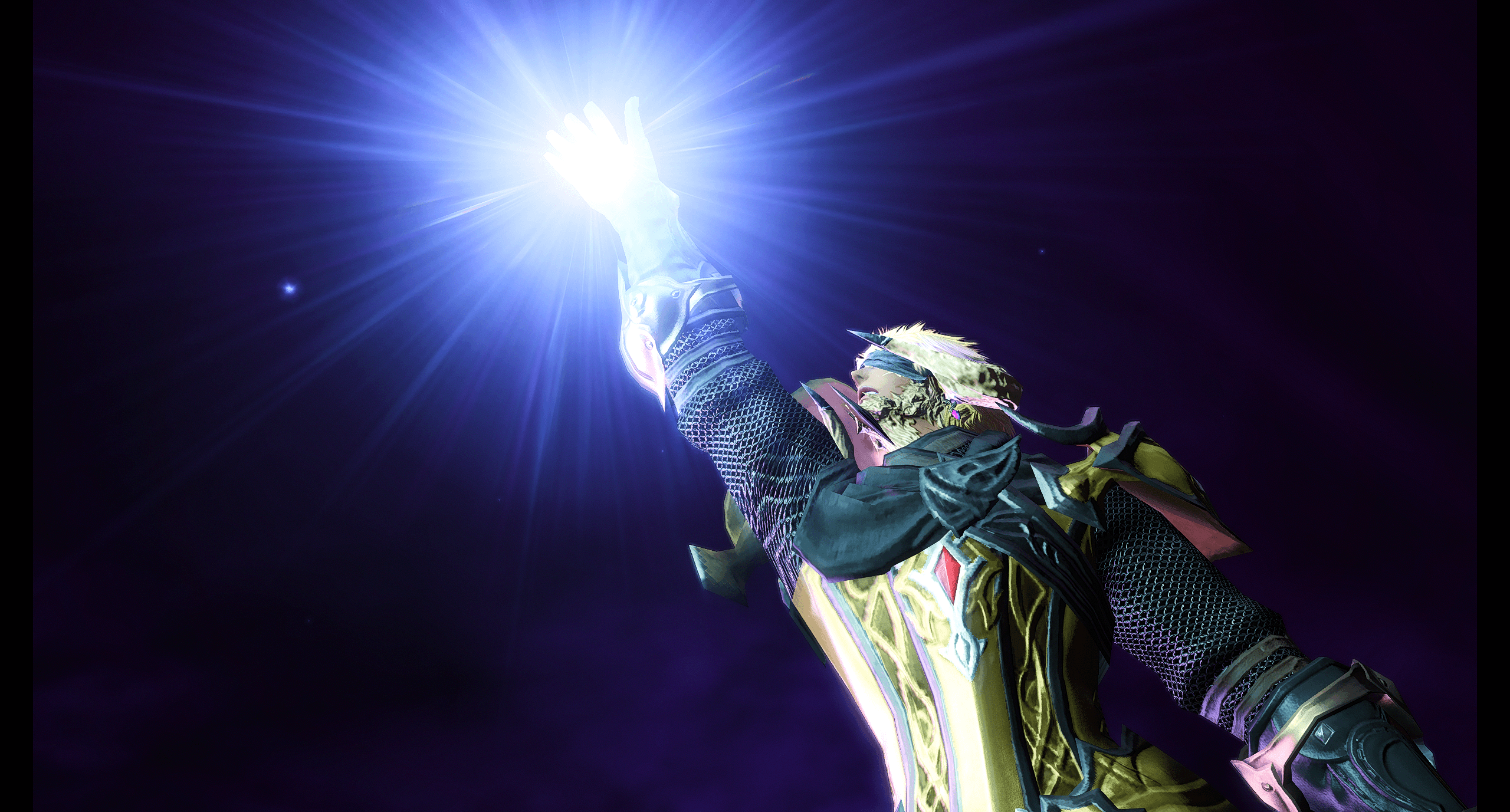 This is one of the first actual gposes I did, as in actually playing around with the gpose tool and its possibilities. I still really like it actually, but its helped by the boy being handsome and the Samurai animations being excellent (his color motif used to be yellow!)