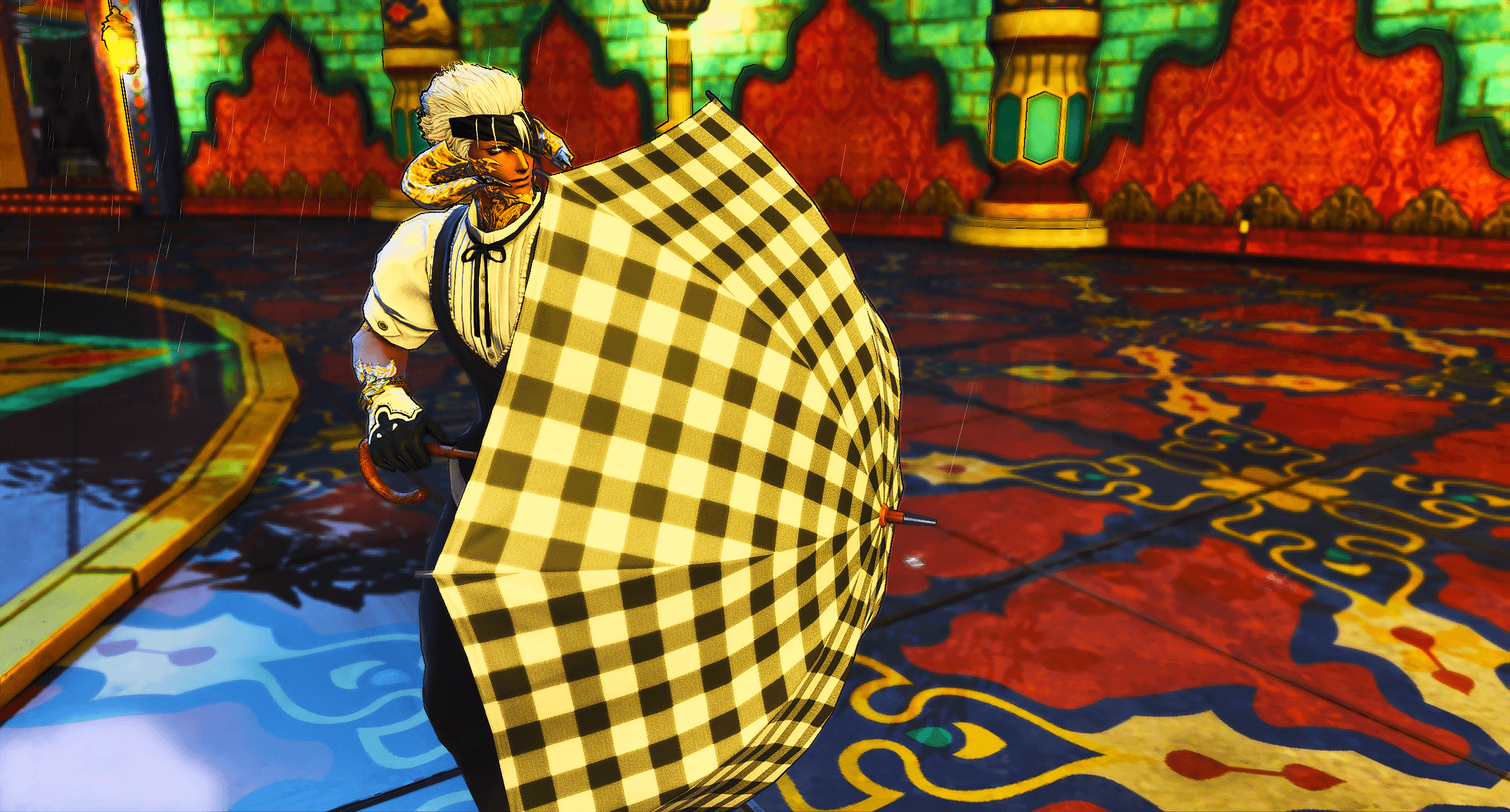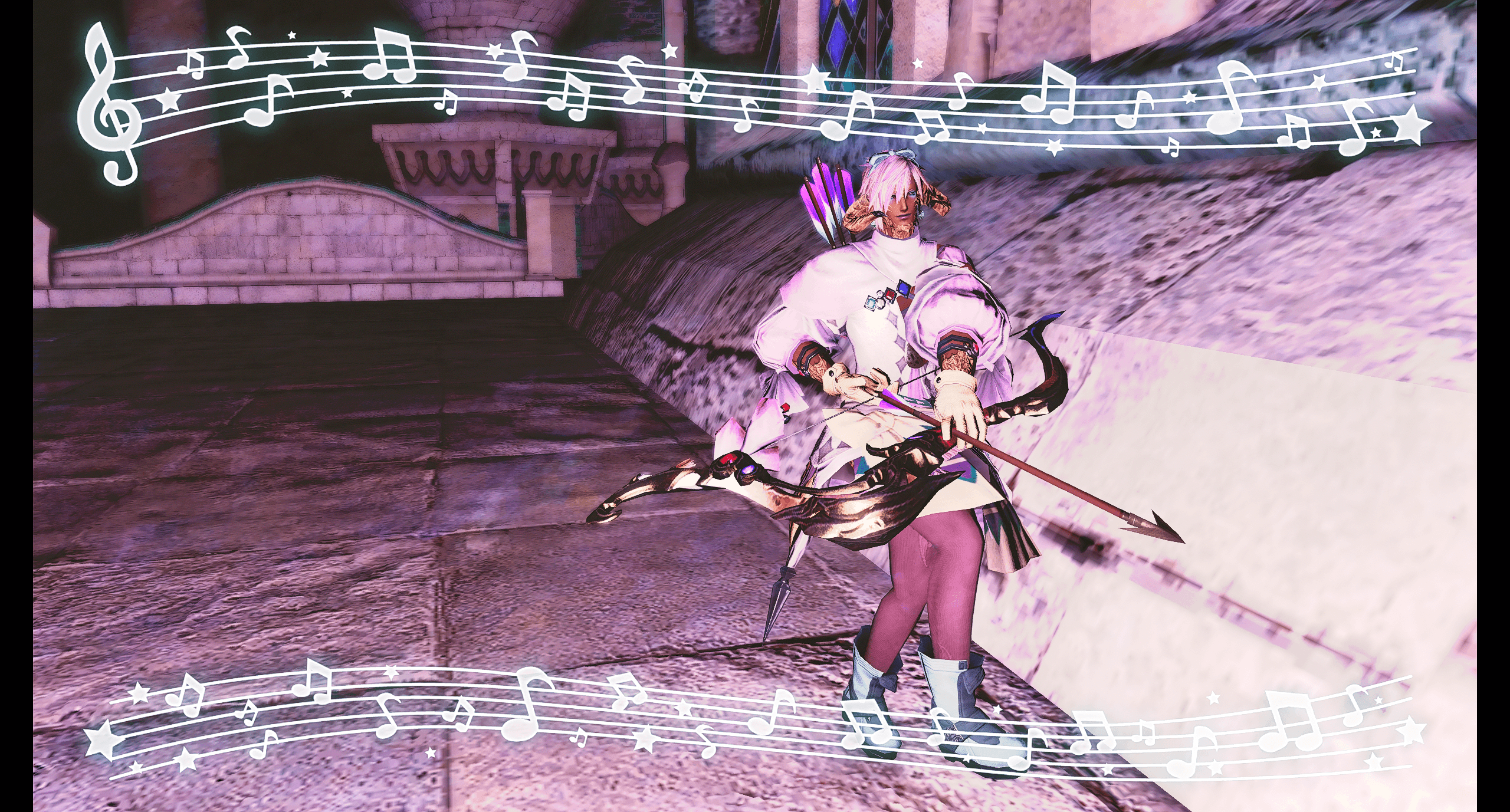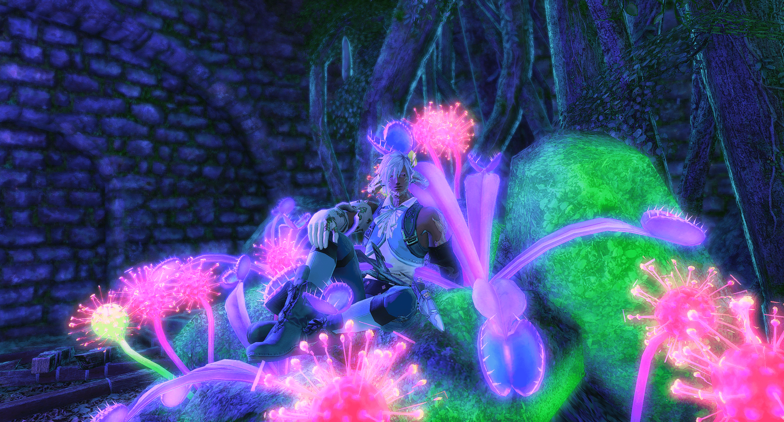 This is one of the first actual gposes I did, as in actually playing around with the gpose tool and its possibilities. I still really like it actually, but its helped by the boy being handsome and the Samurai animations being excellent (his color motif used to be yellow!)